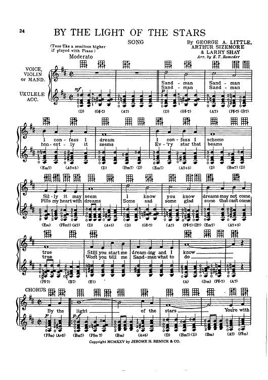 Digital Sheet Music for By The Light Of The Stars by , Larry Shay, Arthur Sizemore, Geo. A. Little, E. T. Romeder scored for Ukulele; id:418663