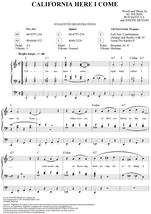 Digital Sheet Music for California Here I Come by Al Jolson, Joseph Meyers, Buddy DeSylva scored for Easy Organ/Vocal; id:265689