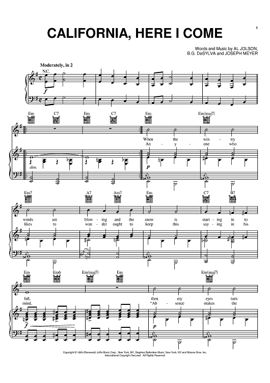 Digital Sheet Music for California, Here I Come by Al Jolson, Joseph Meyer, Benny Goodman, Buddy DeSylva scored for Piano/Vocal/Chords; id:368537