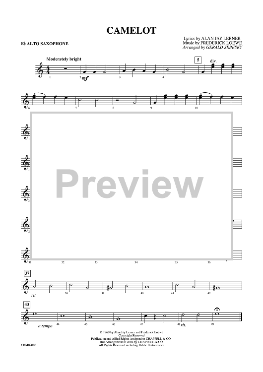Digital Sheet Music for Camelot - Alto Saxophone by Frederick Loewe, Alan Jay Lerner, Gerald Sebesky scored for Concert Band; id:313686