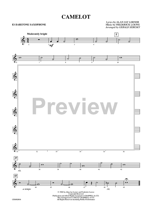 Digital Sheet Music for Camelot - Baritone Saxophone by Frederick Loewe, Alan Jay Lerner, Gerald Sebesky scored for Concert Band; id:313688