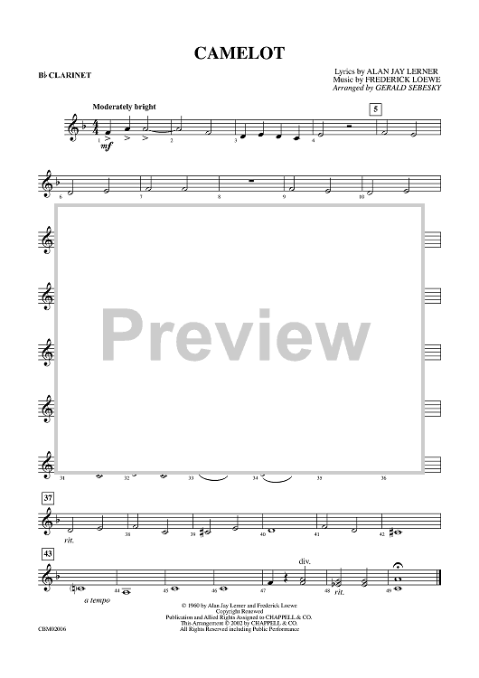 Digital Sheet Music for Camelot - Clarinet in B-flat by Frederick Loewe, Alan Jay Lerner, Gerald Sebesky scored for Concert Band; id:313684