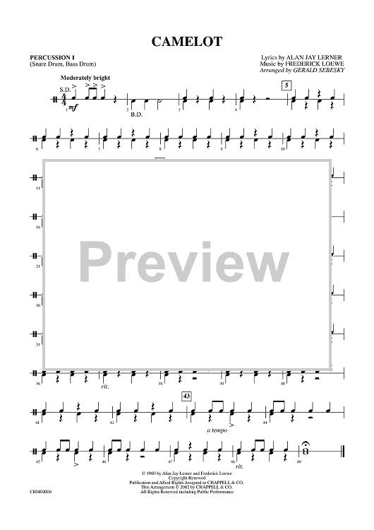 Digital Sheet Music for Camelot - Percussion 1 by Frederick Loewe, Alan Jay Lerner, Gerald Sebesky scored for Concert Band; id:313703