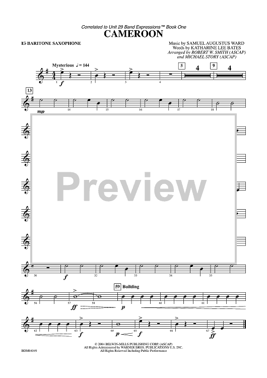 Digital Sheet Music for Cameroon - Baritone Saxophone by Robert W. Smith, Samuel A. Ward, Katherine Lee Bates, Michael Story scored for Concert Band; id:313854