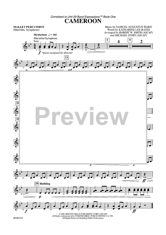 Digital Sheet Music for Cameroon - Mallet Percussion by Robert W. Smith, Samuel A. Ward, Katherine Lee Bates, Michael Story scored for Concert Band; id:313866