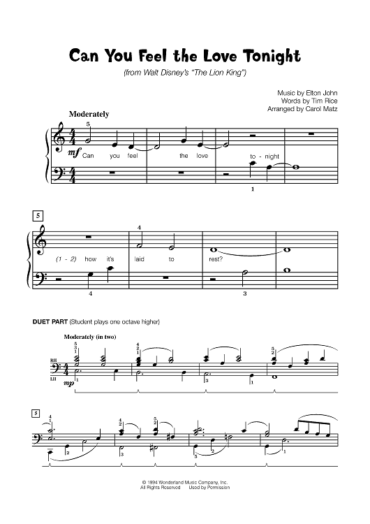 Digital Sheet Music for Can You Feel The Love Tonight by Elton John, Tim Rice, Carol Matz scored for Piano; id:451494