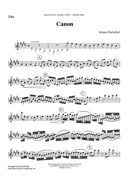 Digital Sheet Music for Canon - Part 1 Clarinet in Bb by , Johann Pachelbel, Daniel Kelley scored for Instrumental Quartet; id:423711