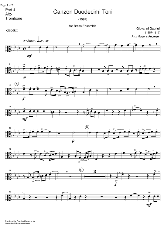 Digital Sheet Music for Canzon Duodecimi Toni - Alto Trombone by Giovanni Gabrieli, Mogens Andresen scored for Brass Ensemble; id:323293