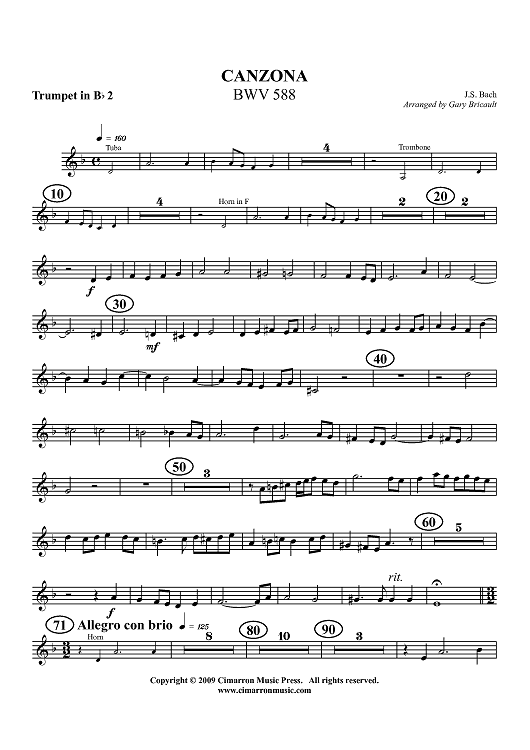 Digital Sheet Music for Canzona, BWV 588 - Trumpet 2 in Bb by Johann Sebastian Bach, Gary Bricault scored for Brass Quintet; id:416296