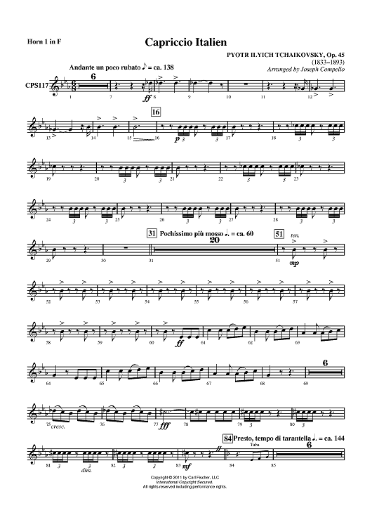 Digital Sheet Music for Capriccio Italien - Horn 1 in F by Joseph Compello, Peter Ilyich Tchaikovsky scored for Concert Band; id:420228