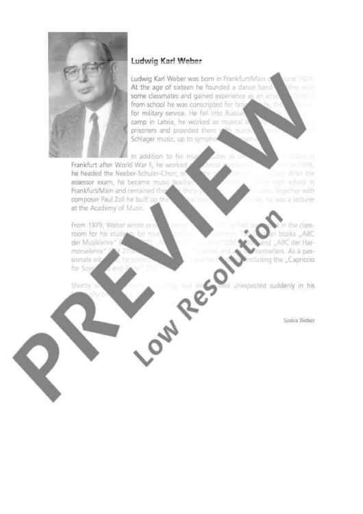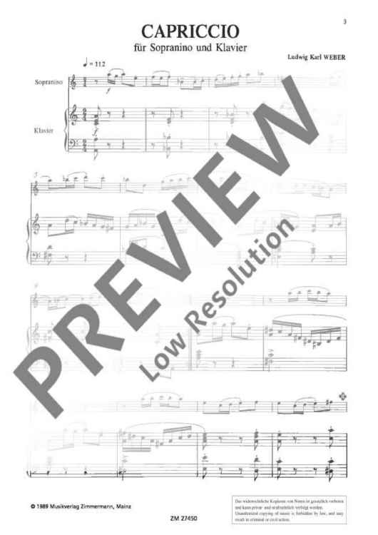 Der Frankfurter Komponist und Musikpädagoge Ludwig Karl Weber (1924-1988) schrieb das Capriccio aus der Praxis des häuslichen Musizierens für die Praxis in Schule, Instrumentalunterricht und Hausmusik. Das Stück wechselt wirkungsvoll zwischen rechter Hand des Klaviers und dem Sopranino.