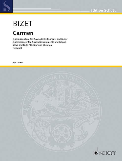 Is it possible to reduce large opera scores to scores for a small ensemble which even includes a guitar? If you let yourself in for it, you will be amply rewarded: beautiful melodies, magnificent interaction of harmonic and musico-dramatic elements of surprise, and a recognition value among the audience who loves to discover great known melodies like 'Carmen' by Georges Bizet in an entirely new musical environment. Thus, with the guitar in the role of the foundation which is given interesting, previously unknown tasks, this piece is a most welcome addition to the existing chamber music repertoire.