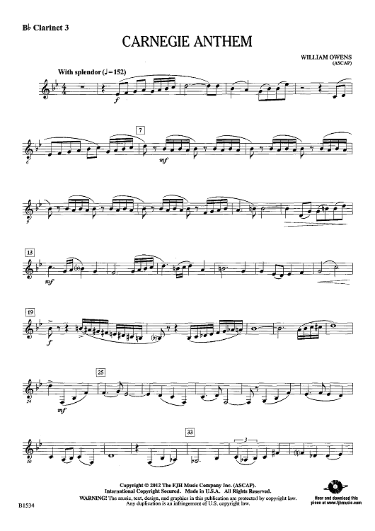 Digital Sheet Music for Carnegie Anthem - Bb Clarinet 3 by William Owens scored for Concert Band; id:440727