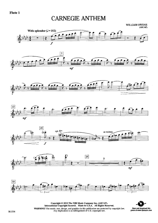 Digital Sheet Music for Carnegie Anthem - Flute 1 by William Owens scored for Concert Band; id:440721