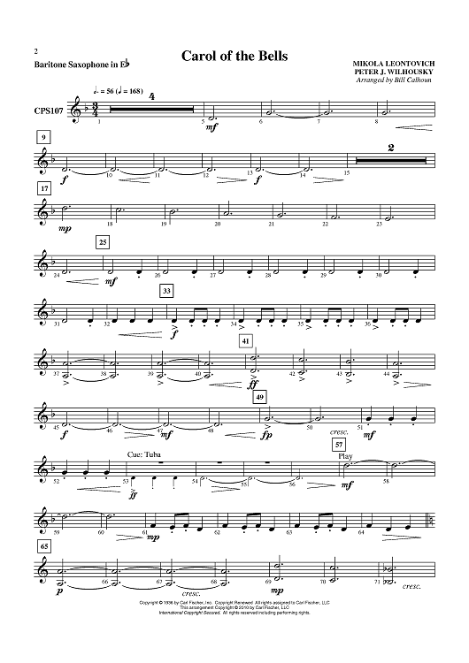 "Carol of the Bells - Baritone Sax" Sheet Music by Mikola Leontovich