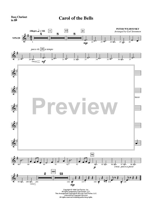 Digital Sheet Music for Carol of the Bells - Bass Clarinet in Bb by Peter J. Wilhousky scored for Concert Band; id:452654