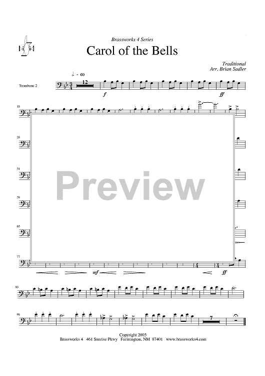 Digital Sheet Music for Carol of the Bells - Trombone 2 by Traditional, Brian Sadler scored for Brass Ensemble; id:410218