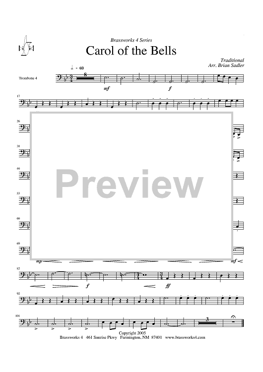 Digital Sheet Music for Carol of the Bells - Trombone 4 by Traditional, Brian Sadler scored for Brass Ensemble; id:410220