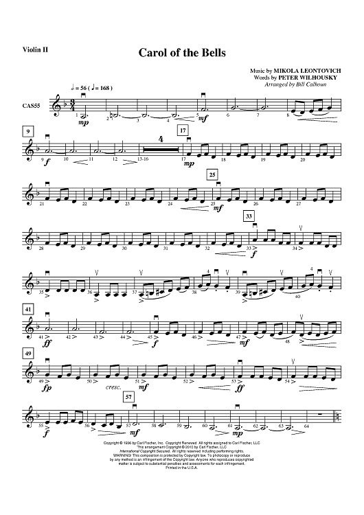 Digital Sheet Music for Carol of the Bells - Violin 2 by Bill Calhoun, Mikola Leontovic scored for Orchestra; id:410951