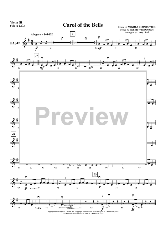 Digital Sheet Music for Carol Of The Bells - Violin 3/Viola by Larry Clark, Mikola Leontovich scored for Orchestra; id:406742