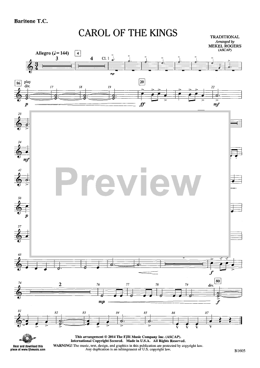Digital Sheet Music for Carol of the Kings - Baritone TC by Traditional, Mekel Rogers scored for Concert Band; id:443380