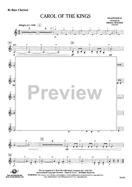 Digital Sheet Music for Carol of the Kings - Bb Bass Clarinet by Traditional, Mekel Rogers scored for Concert Band; id:443371