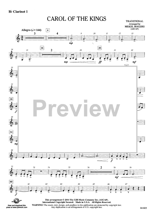 Digital Sheet Music for Carol of the Kings - Bb Clarinet 1 by Traditional, Mekel Rogers scored for Concert Band; id:443369