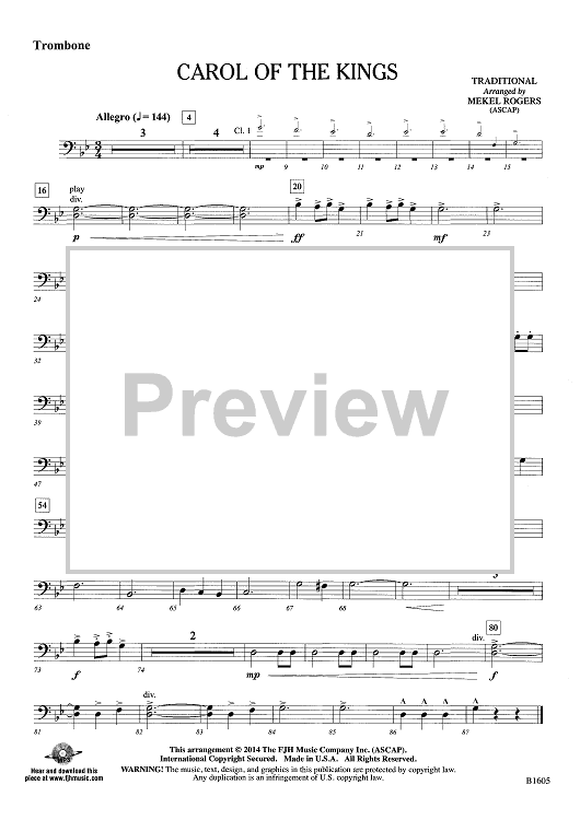 Digital Sheet Music for Carol of the Kings - Trombone by Traditional, Mekel Rogers scored for Concert Band; id:443378