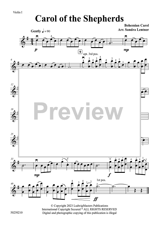 Digital Sheet Music for Carol of the Shepherds - Violin 1 by Traditional, Sandra Lentner scored for String Orchestra; id:507692