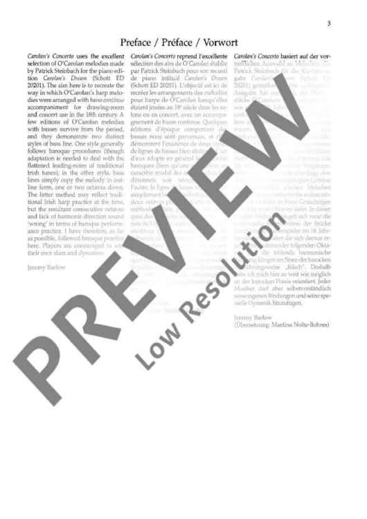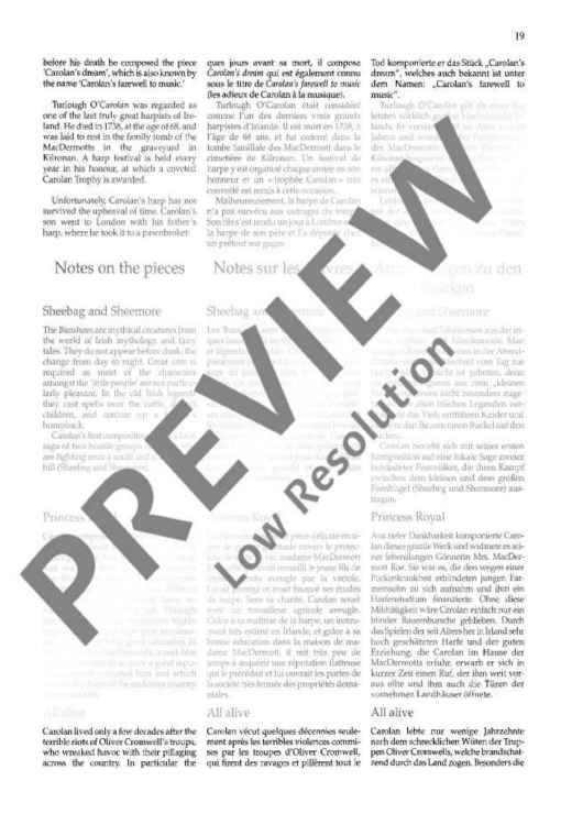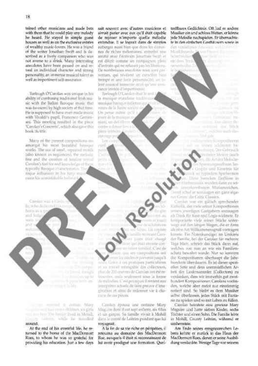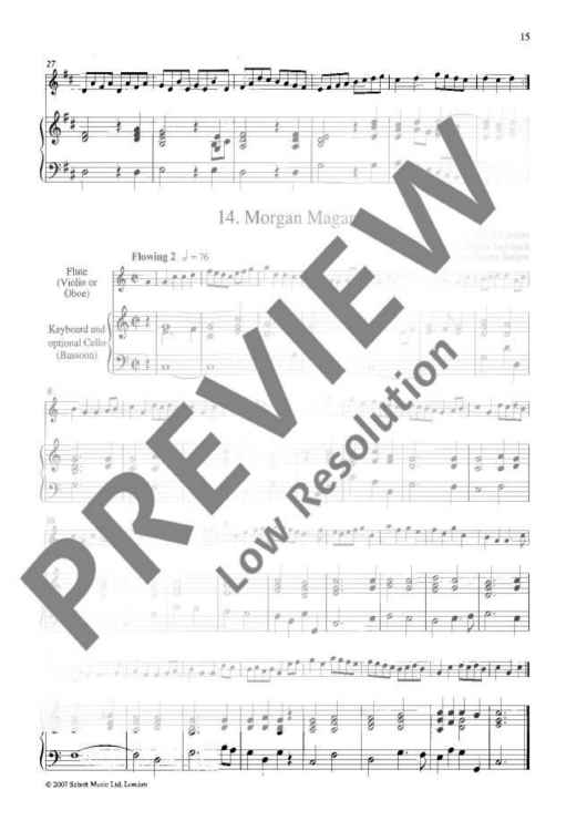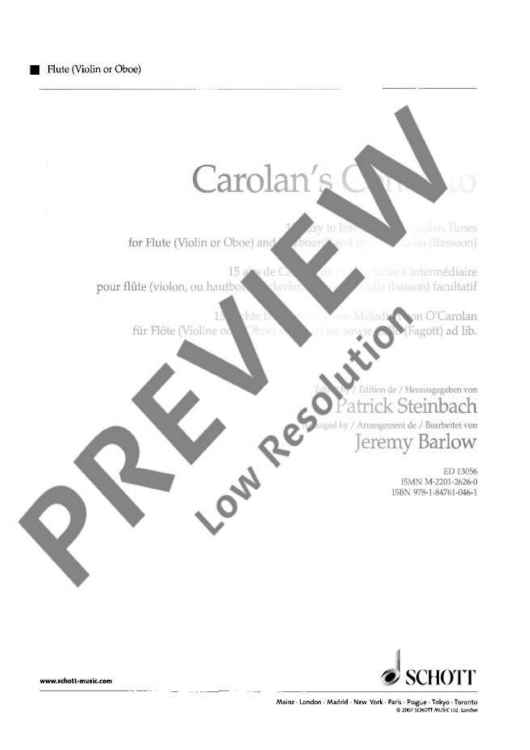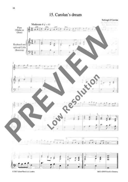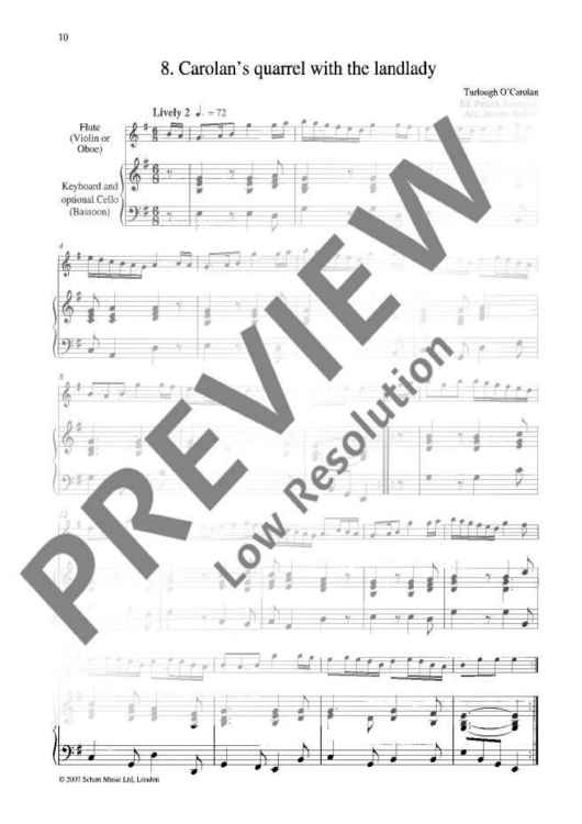 The latest addition to the fast-growing 'Baroque Around the World' series is an Irish album, consisting of fifteen haunting melodies by the legendary 18th-century Irish harpist Turlough O'Carolan. The selection, of easy to intermediate standard, has been made by Patrick Steinbach; the pieces range in style from the Corelli-influenced 'Carolan's Concerto', through the rumbustious 'Carolan's quarrel with the landlady', to the composer's moving final air, 'Carolan's dream'. Arrangements, for flute (violin, oboe) and keyboard, with optional cello or bassoon, are by Jeremy Barlow, who has edited three other volumes in 'Baroque Around the World', of English, French and Swedish music.