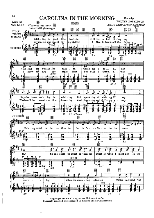 Digital Sheet Music for Carolina In The Morning by , Gus Kahn, Walter Donaldson, Zarh Myron Bickford scored for Ukulele; id:418519