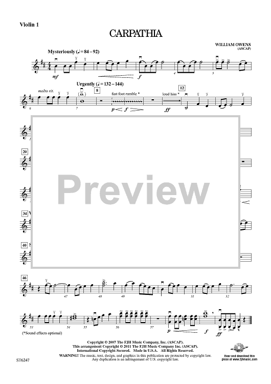 Digital Sheet Music for Carpathia - Violin 1 by William Owens scored for String Orchestra; id:421829