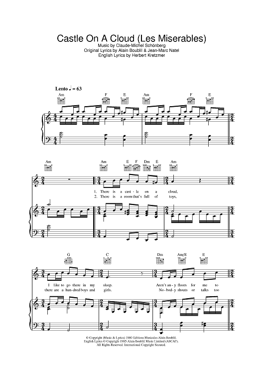 Digital Sheet Music for Castle On A Cloud (Une Poupee Dans La Vitrine) by Claude-Michel Schonberg, Herbert Kretzmer, Alain Boublil, Jean-Marc Natel scored for Piano/Vocal/Chords; id:401438