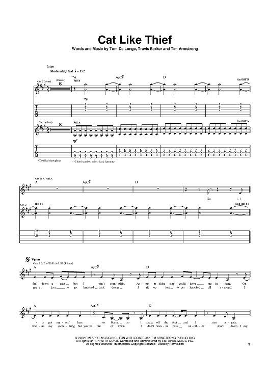Digital Sheet Music for Cat Like Thief by Travis Barker, Tim Armstrong, Box Car Racer, Tom DeLonge scored for Guitar Tab; id:369439