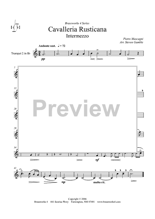 Digital Sheet Music for Cavalleria Rusticana - Trumpet 2 in B-flat by Pietro Mascagni, Steven Gamble scored for Brass Quintet; id:358094