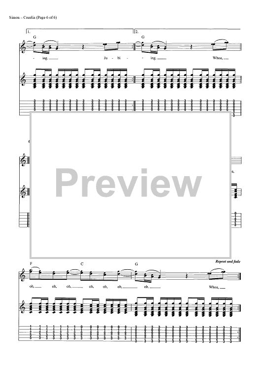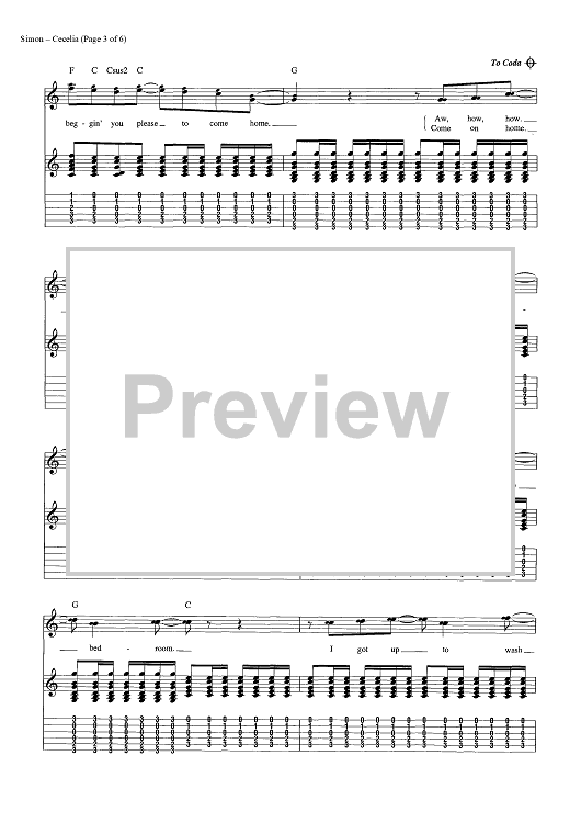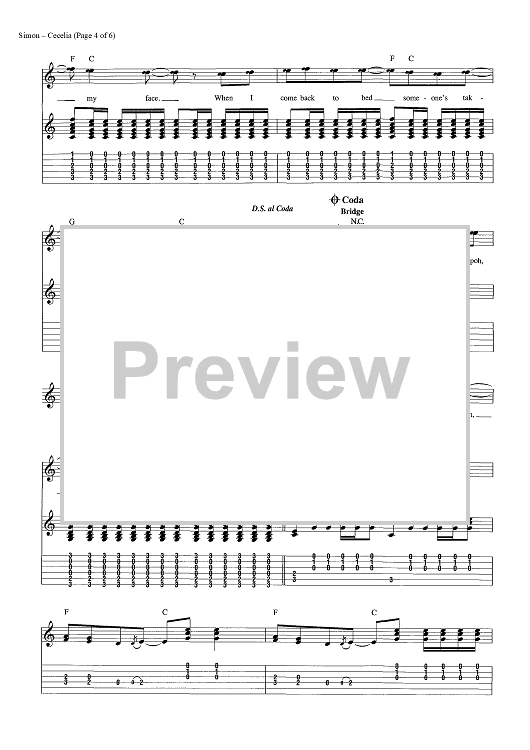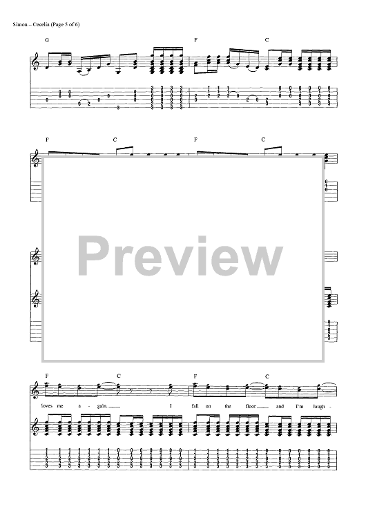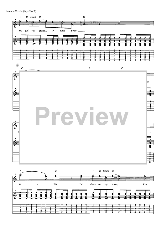 Digital Sheet Music for Cecilia by Paul Simon, Simon & Garfunkel scored for Guitar Tab/Vocal/Chords; id:454420