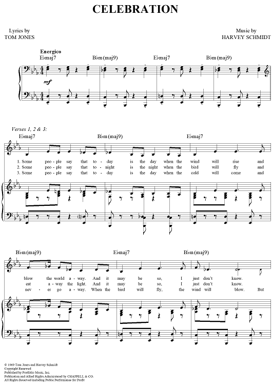 Digital Sheet Music for Celebration by Tom Jones, Harvey Schmidt scored for Piano/Vocal/Chords; id:304246