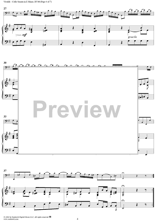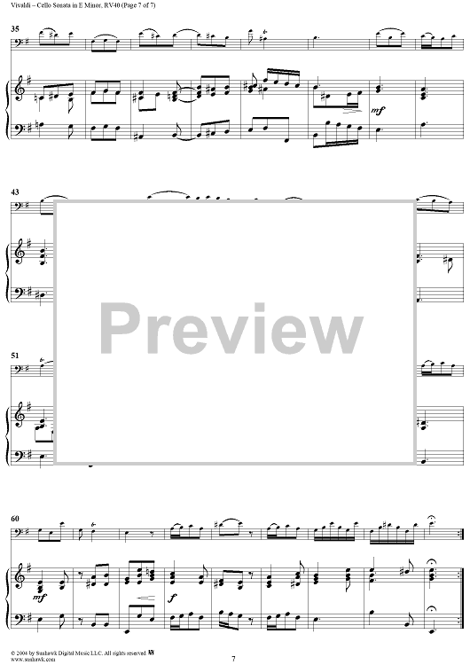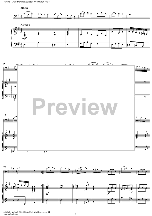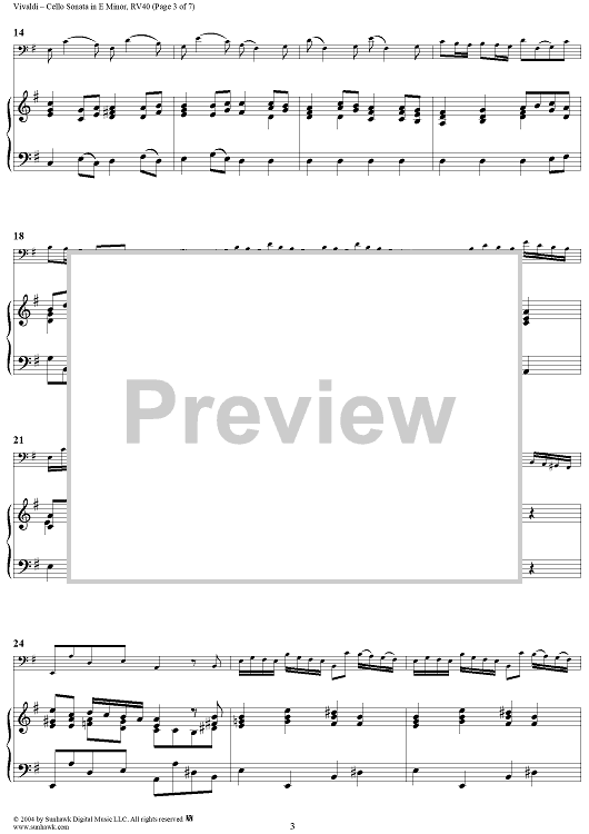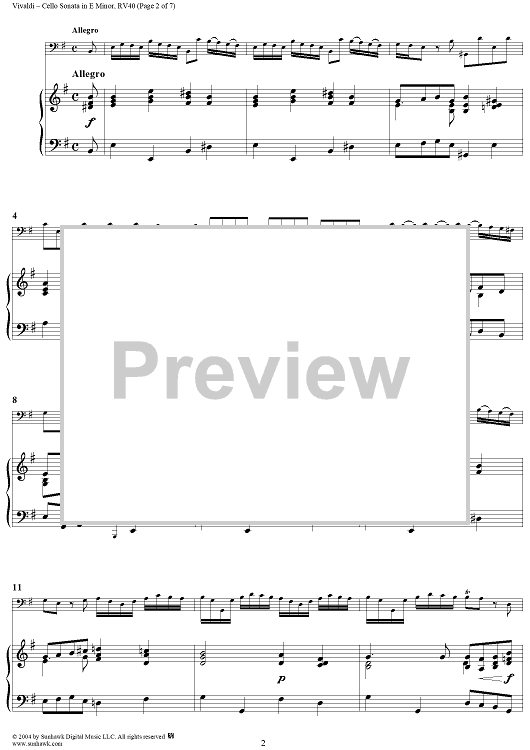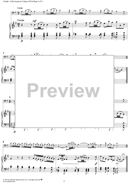 Digital Sheet Music for Cello Sonata No. 5 in E Minor, RV40 - Piano by Antonio Vivaldi scored for Cello/Continuo/Piano; id:296708