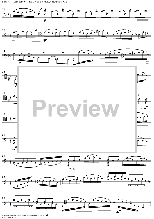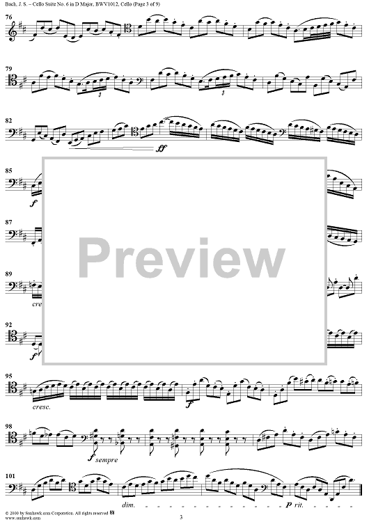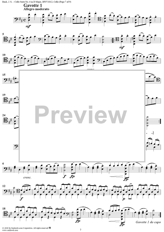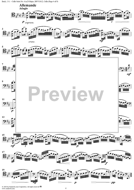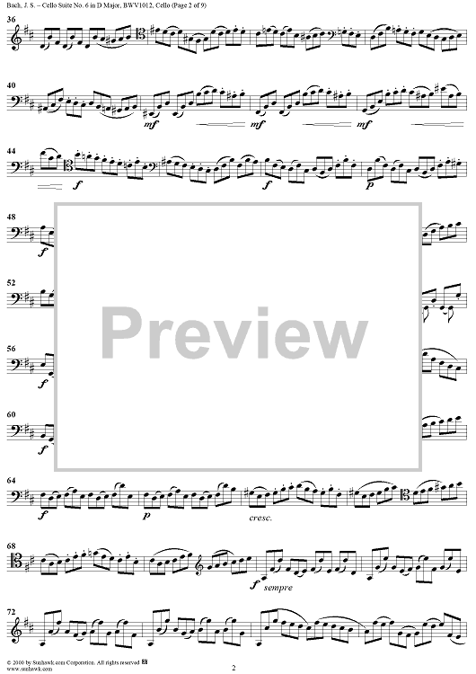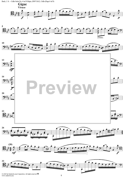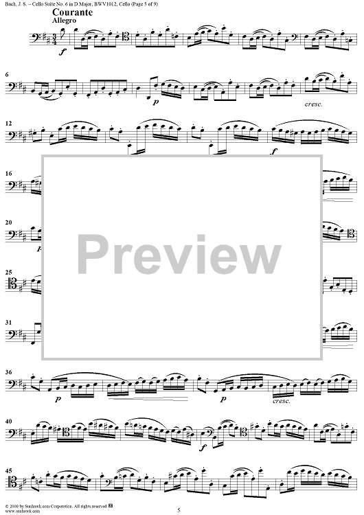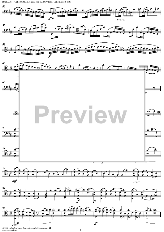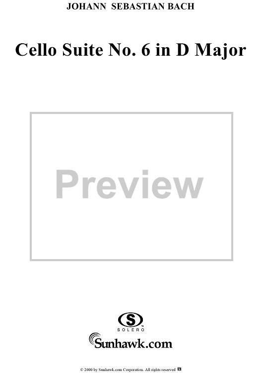 Digital Sheet Music for Cello Suite No. 6 in D Major (Unaccompanied) by Johann Sebastian Bach scored for Cello Solo; id:281014