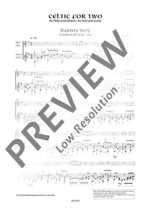 „Celtic for Two“ - die schönsten und bekanntesten Irish Folksongs und Balladen für Flöte und Gitarre: Danny Boy, Down by the Salley Gardens, Whiskey In The Jar, The Last Rose of Summer, Molly Malone, The Foggy Dew und viele andere Stücke, klangvoll und variabel bearbeitet für Gitarre und Flöte von Volker Luft. Die Sammlung eignet sich hervorragend für konzertante Aufführungen, kammermusikalisches Musizieren sowie den Einsatz im Instrumentalunterricht und das Musikschulvorspiel. Volker Luft ist Gitarrist und Komponist mit nationalen und internationalen Veröffentlichungen seiner Kompositionen, Gitarrenbearbeitungen und CDs. Neben Konzerten und Studioproduktionen (Kammermusik, Musikhörspiele, Sologitarre) Tätigkeit als Gitarrenlehrer, Dozent und Workshopautor für Fachzeitschriften. Im Musikverlag Zimmermann erschien bereits "Celtic", Fiddle Tunes für Gitarre mit Tabulatur (ZZM 35940).