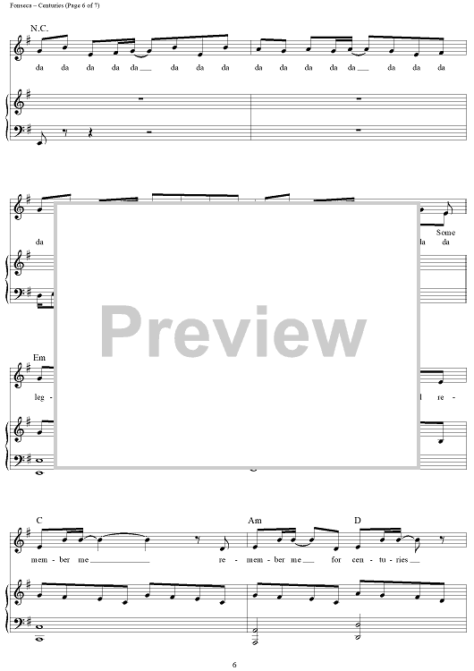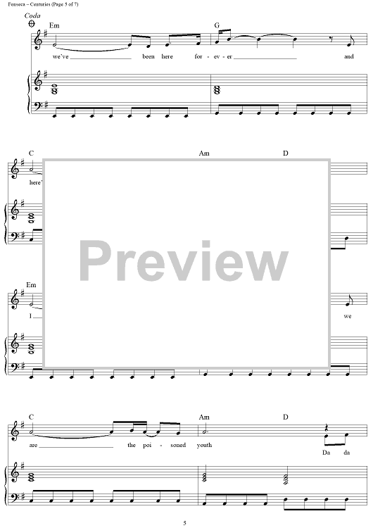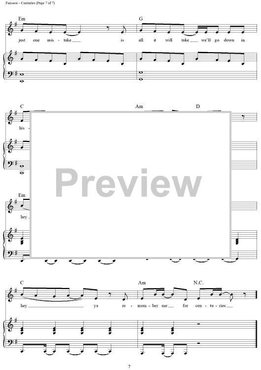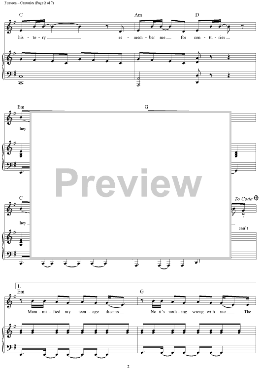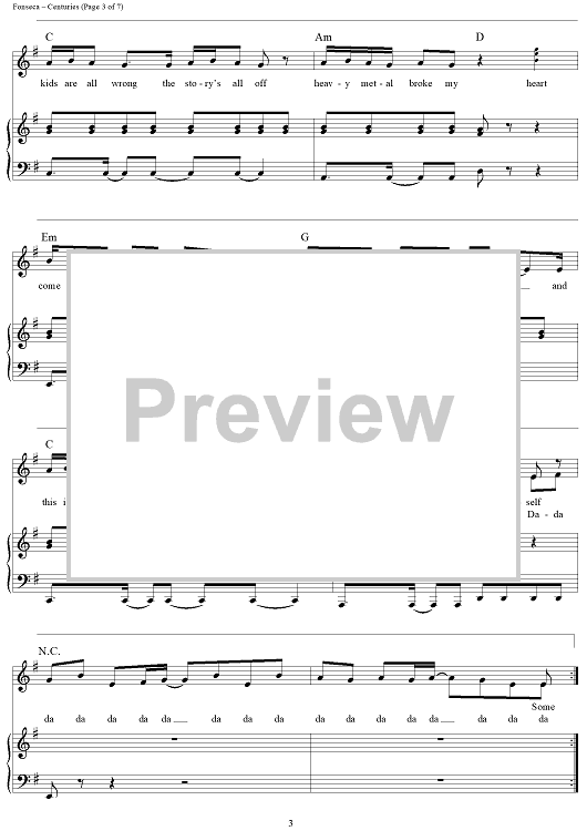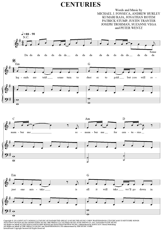 Digital Sheet Music for Centuries by Suzanne Vega, Jonathan Rotem, Patrick Stump, Peter Wentz, Andrew John Hurley, Joseph Trohman, Fall Out Boy, Michael J. Fonseca, Kumari Raja, Justin Tranter scored for Piano/Vocal/Chords; id:446786