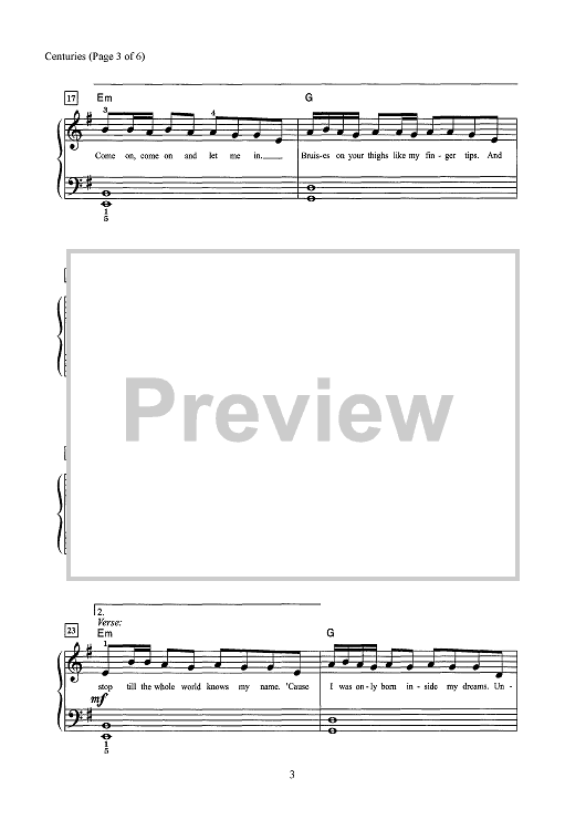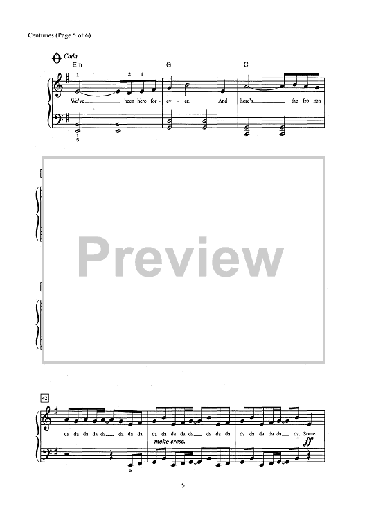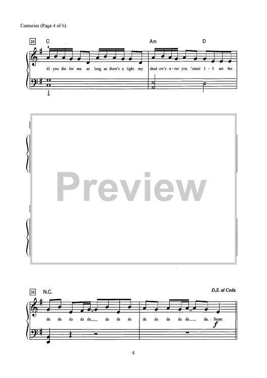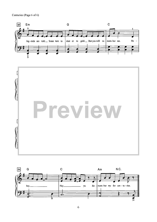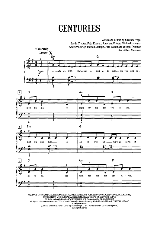 Digital Sheet Music for Centuries by Suzanne Vega, Jonathan Rotem, Patrick Stump, Peter Wentz, Andrew John Hurley, Joseph Trohman, Fall Out Boy, Michael J. Fonseca, Kumari Raja, Justin Tranter, Albert Mendoza scored for Big Note Piano; id:466796