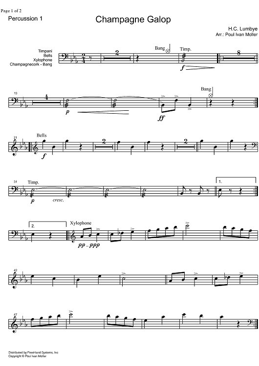 Digital Sheet Music for Champagne Galop - Percussion 1 by , Hans Lumbye, Poul Ivan Moller scored for Concert Band; id:328448