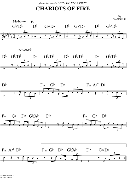 Digital Sheet Music for Chariots of Fire (Main Title) by , Vangelis scored for Lead Sheet; id:111620
