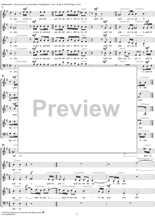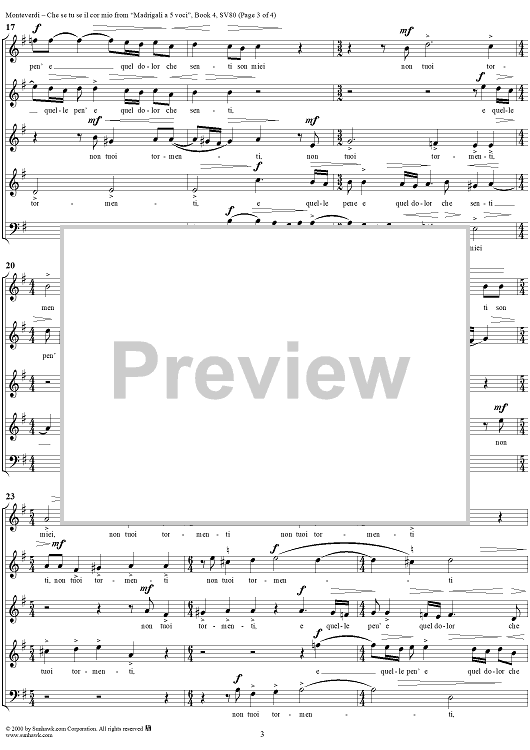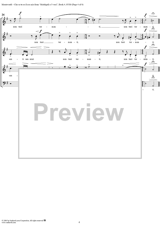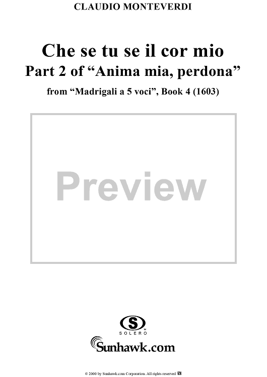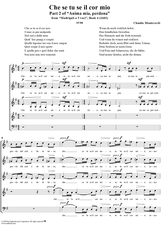 Digital Sheet Music for Che se tu se il cor mio - Part 2 of "Anima mia, perdona" from "Madrigali à 5 voci" Book 4 (1603) - SV80 by Claudio Monteverdi scored for Four-part Mixed Chorus; id:253107