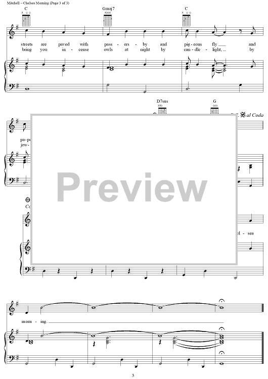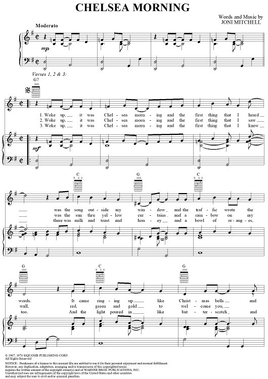 Digital Sheet Music for Chelsea Morning by Joni Mitchell scored for Piano/Vocal/Chords; id:120711
