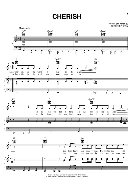 Digital Sheet Music for Cherish by Terry Kirkman, The Association, David Cassidy scored for Piano/Vocal/Chords; id:383682