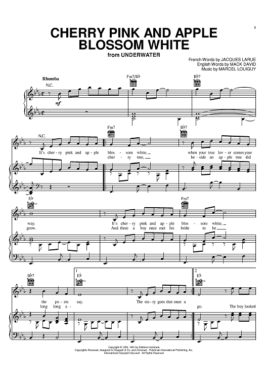 Digital Sheet Music for Cherry Pink And Apple Blossom White by Mack David, Perez Prado, Louiguy, Jacques Larue, Alan Dale, Jarry Murad's Harmonicats scored for Piano/Vocal/Chords; id:368606