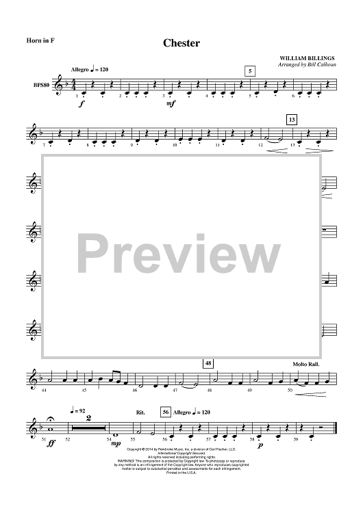 Digital Sheet Music for Chester - Horn in F by William Billings, Bill Calhoun scored for Concert Band; id:450668
