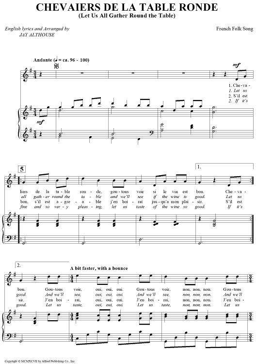 Digital Sheet Music for Chevaiers De La Table Ronde (Let Us All Gather Round the Table) by French Folk Song, Jay Althouse scored for Piano/Vocal; id:459481